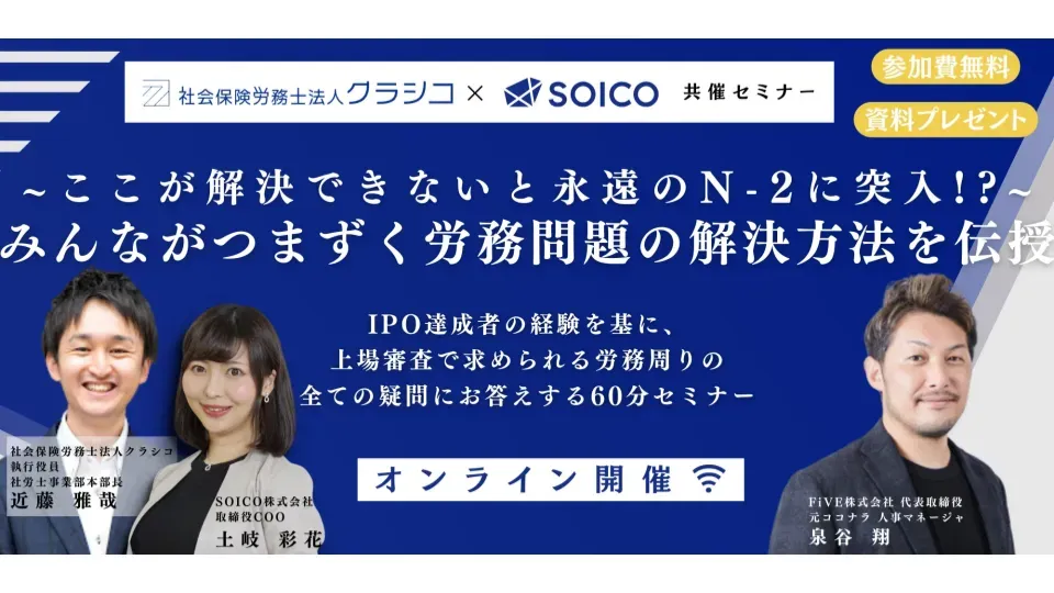 弊社代表の泉谷がSOICO株式会社さまと社会保険労務士法人クラシコさまの共催ウェビナーにて登壇しました